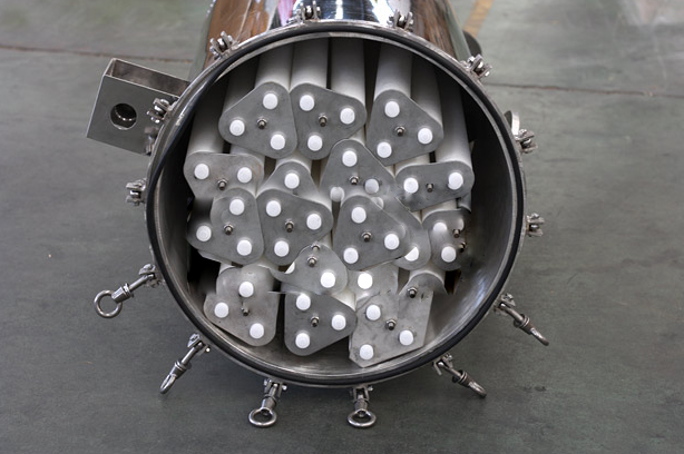 5.以設備中的拉桿為軸心,套入壓板,濾芯的上定位圈插入相對應的壓板孔內,擰緊壓緊螺母;